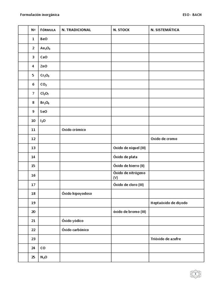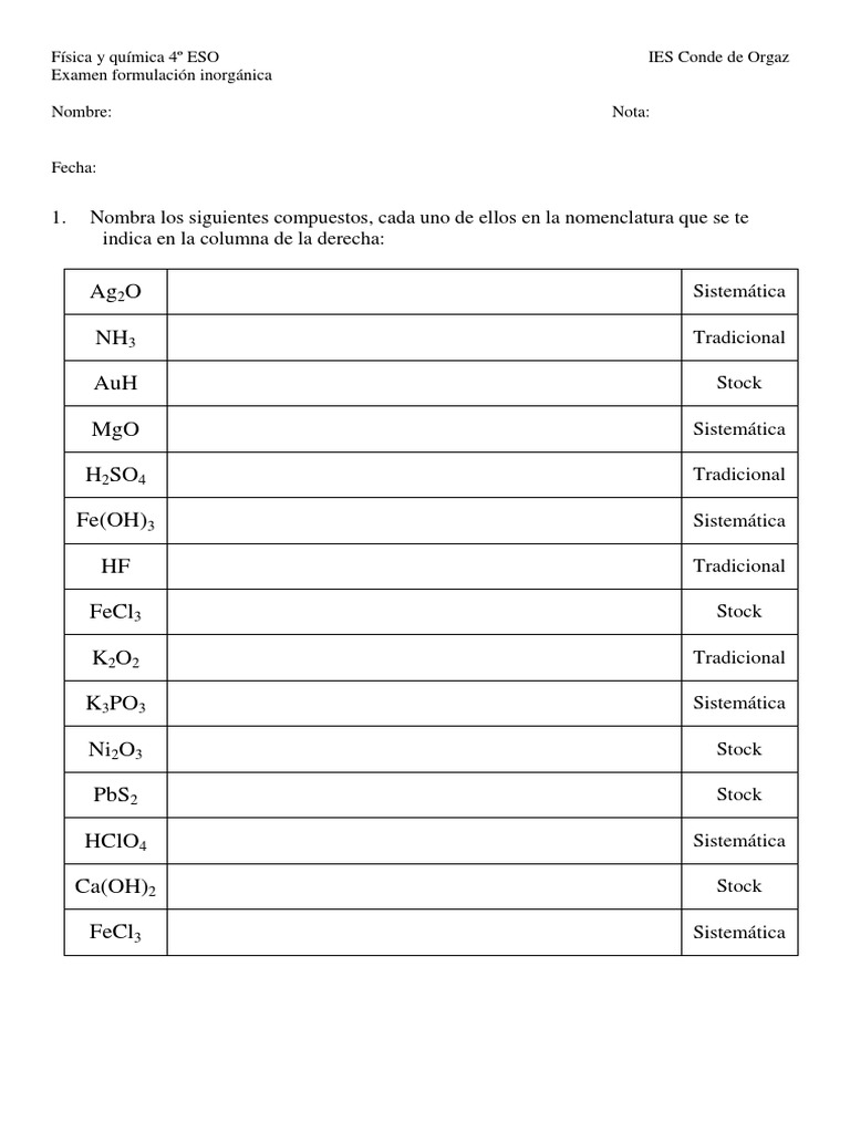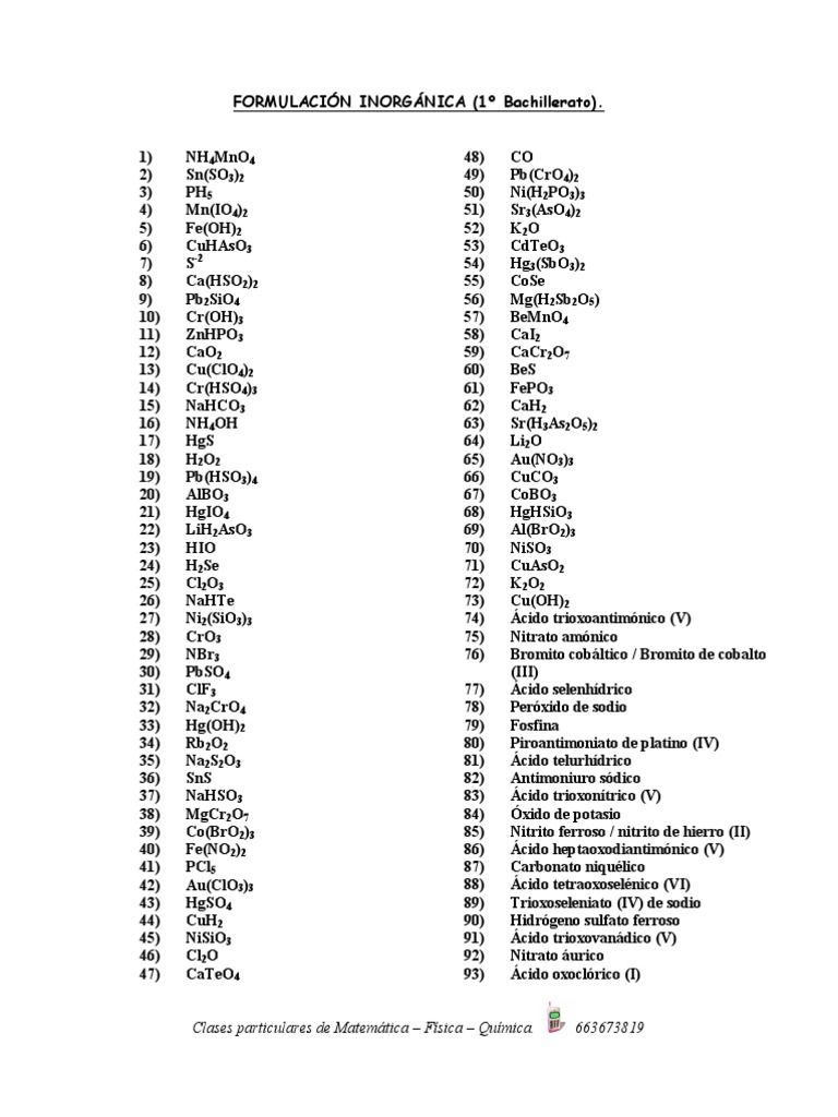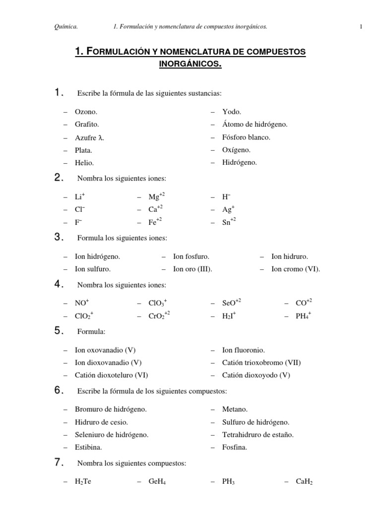 Ejercicios Formulacion Inorganica 1 Bachillerato. WebEjercicios Formulación Inorgánica. Nivel ESO; Nivel BACHILLERATO. Ejercicios Básicos Repaso; Ejercicios 1; Ejercicios 2; Ejercicios 3; Formulación y Nomenclatura. WebQuímica 1º Bachillerato, ejercicios resueltos - Academia Alcover Inicio / Química. 1º de Bachillerato 01. LEYES PONDERALES en Química. 1º de Bachillerato Ejercicios..