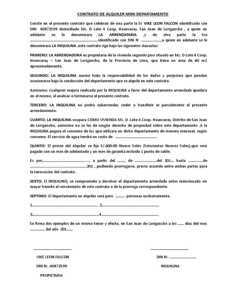 WebEn la reclamación por incumplimiento del contrato de alquiler deberá de incluirse los datos identificativos tanto del arrendatario como del arrendador, la causa por la que se. WebEntre las personas que alquilan alguna vivienda de su propiedad, estos son los incumplimientos del contrato de alquiler más frecuentes: No realizar las reparaciones. WebDemandar incumplimiento de contrato de alquiler. Los términos en los que se acuerde el contrato de alquiler serán vitales para poder introducir las demandas que se. WebHay diferentes motivos por los que puede ocurrir un incumplimiento del contrato de alquiler por parte del arrendador, como por ejemplo que no cumpla con las obligaciones en lo. WebSi en el contrato de alquiler del local se acordó la opción de desistimiento por parte del arrendatario, este podrá marcharse antes de que haya transcurrido la duración. WebEn cambio, y para el caso en que el arrendador no acepte la rescisión y solicite el cumplimiento íntegro del contrato, el Tribunal Supremo en recientes.