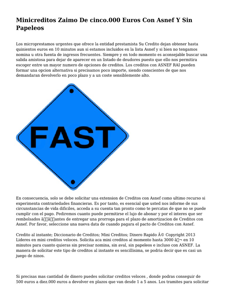 Minicreditos Con Asnef Y Nomina. WebUn minicrédito es un préstamo de entre 50,- y 900,- euros que un prestamista concede para un plazo de devolución de hasta un mes. Debido al pequeño. WebLos minicréditos, son una alternativa financiera diseñada por su cuantía, coste y plazo de devolución para hacer frente a pequeños gastos. Gracias a los minicréditos con ASNEF. .